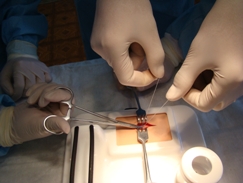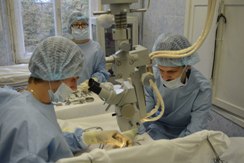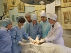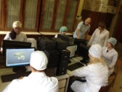 | В экспериментальной операционной занятия со студентами СНО проводит ассистент Косулин А.В. | Практические занятия с интернами проводит доцент А. А. Пашко | Работа на фантомном препарате |