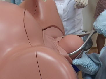 На фантоме для гинекологического обследования студенты осваивают осмотр «в зеркалах», бимануальное исследование, кольпоскопию, гистероскопию с использованием сменных модулей.