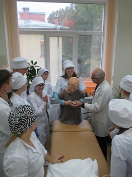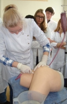 Класс ухода за больным позволяет отрабатывать навыки катетеризации мочевого пузыря, выполнения различных видов клизм, постановки желудочных зондов. На полноростовом манекене проводятся занятия по уходу за пожилыми пациентами. Обучающиеся осваивают технику обработки пролежней, уход за кишечной стомой, гастростомой, трахеостомой, кормление пациентов через зонд и гастростому.
