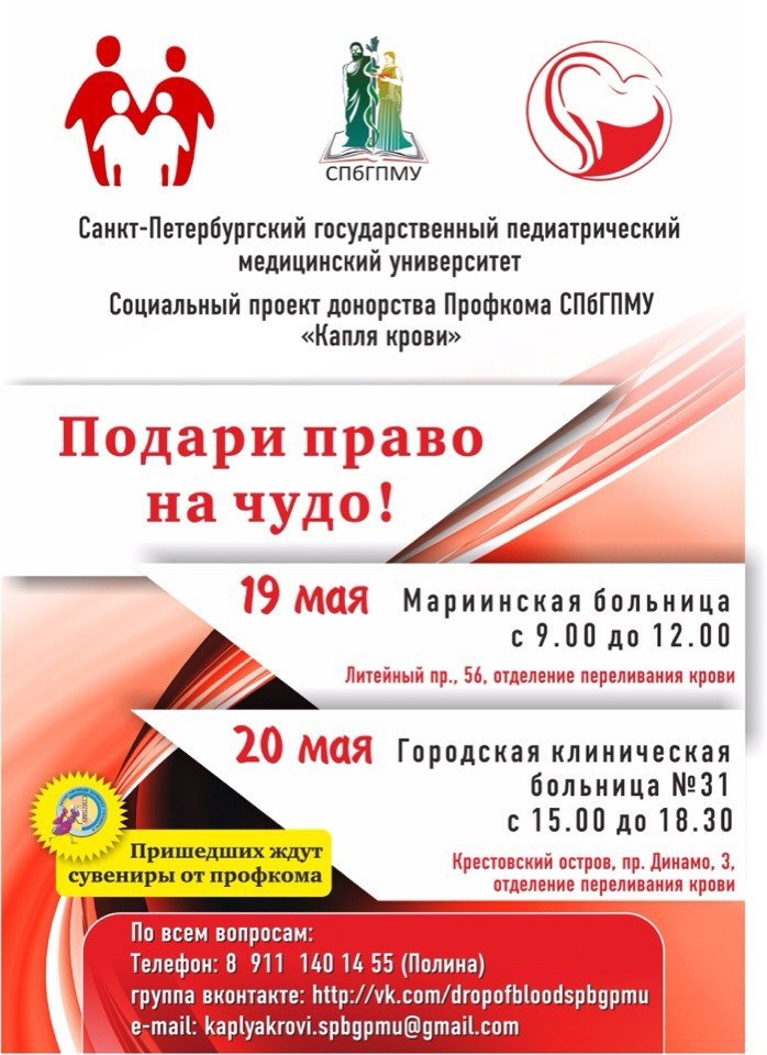 • Регулярные выезды обучающихся университета в отделения переливания крови городских больниц Санкт-Петербурга для дачи крови;